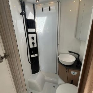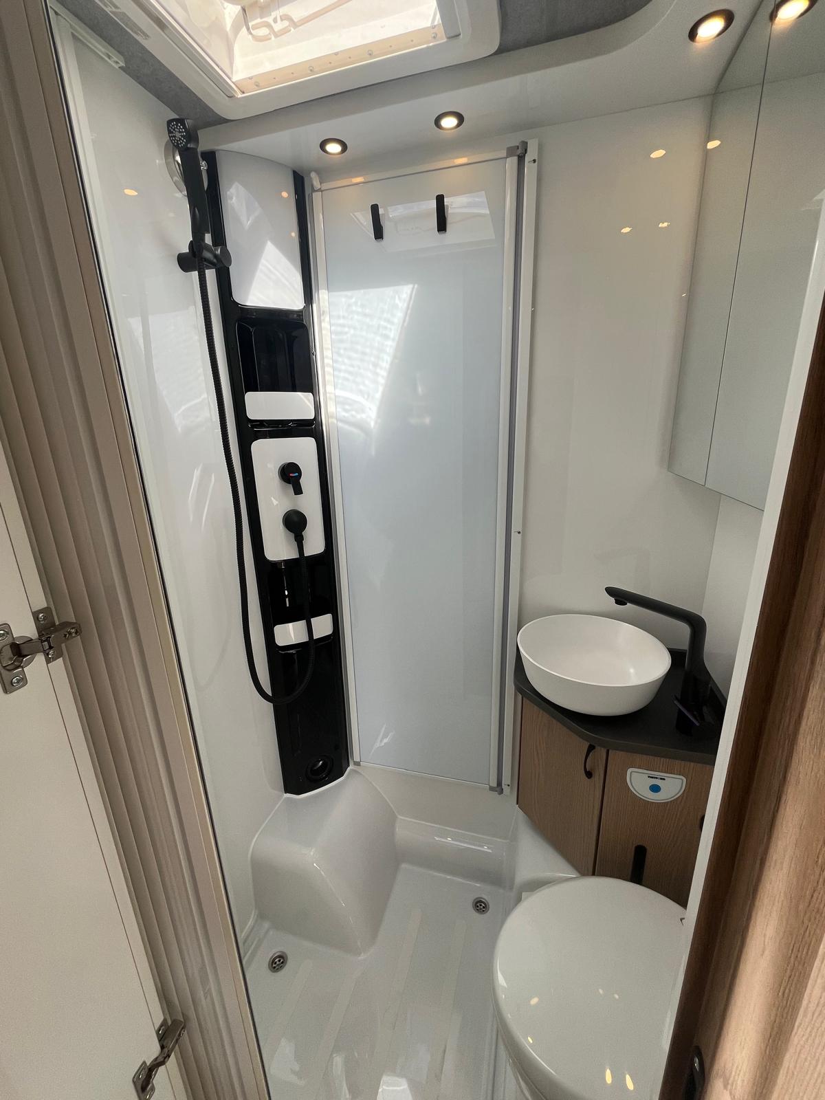 - Cuarto de aseo compacto con ducha integrada, Inodoro giratorio THETFORD, Mampara de ducha, Columna de ducha con grifería y compartimentos,